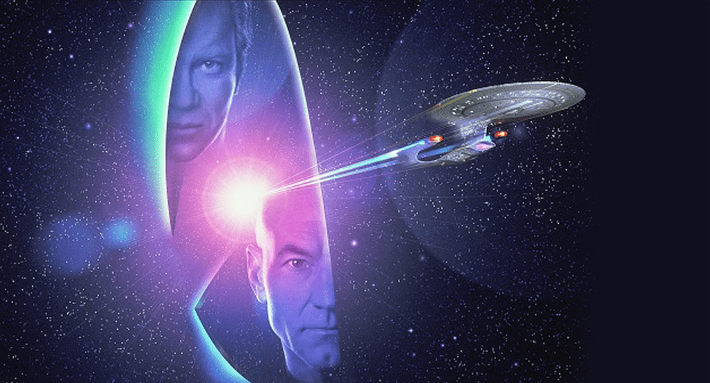 Picard fails to talk Soran out of his plan and is too late to stop him from launching another probe. The collapse of the Veridian star alters the course of the energy ribbon and sweeps Picard and Soran into the Nexus. Picard finds himself surrounded by an idealised family, but realises that it is an illusion. He is confronted by an “echo” of Guinan, and after being told that he may go “wherever and whenever” he wishes within the Nexus, Guinan sends him to meet Kirk, also safe in the Nexus. Though Kirk is at first entranced by the opportunity to make up for past regrets in the Nexus, he likewise realises that nothing there is real. Picard convinces Kirk to leave the Nexus and return to Veridian III shortly before Soran launches the probe.