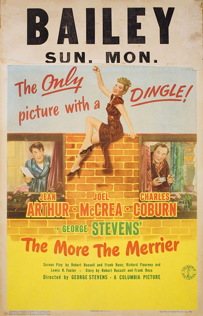 Under fire at Columbia for turning down too many projects, Jean Arthur and her husband Frank Ross’s friend, Garson Kanin offered to write a screenplay – for $25,000 – that they could pitch to studio boss Harry Cohn as a free vehicle for Arthur, which might placate Cohn. Kanin’s “Two’s a Crowd”, with Robert W. Russell co-writing, received Cohn’s go-ahead. Other titles considered included “Washington Story”, “Full Steam Ahead”, “Come One, Come All” and “Merry-Go-Round”, which actually tested best with audiences. Washington officials objected to the title and plot elements that suggested “frivolity on the part of Washington workers”. The More the Merrier was finally approved as the title.