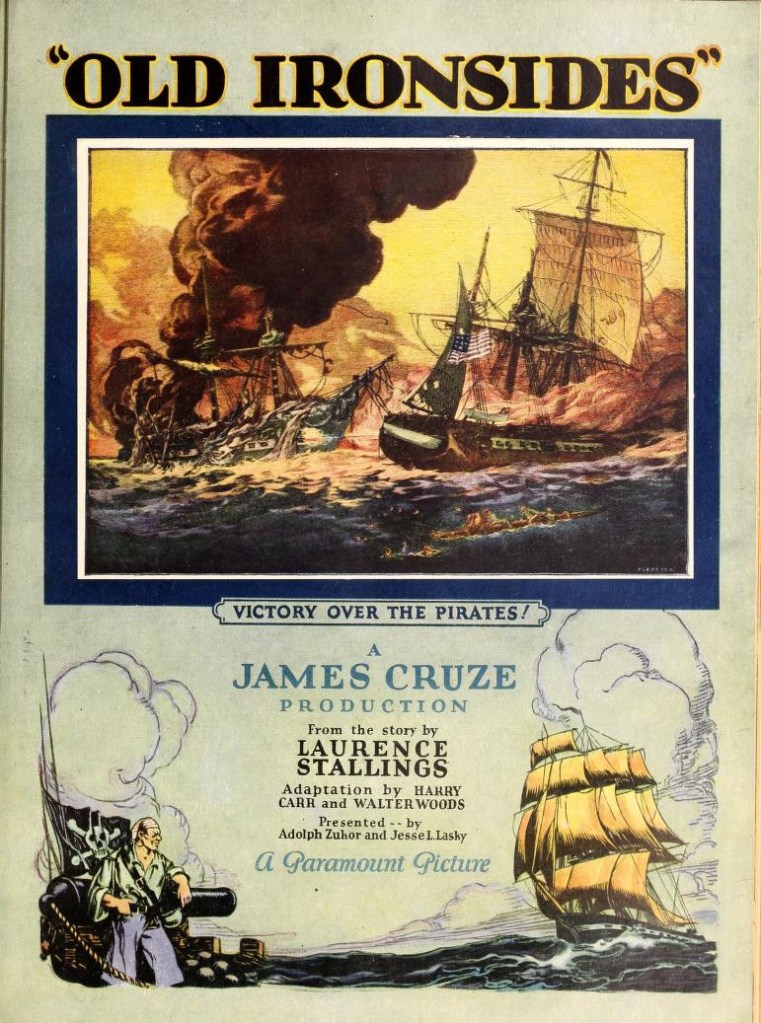The movie was directed by James Cruze in a widescreen process that Paramount promoted as “Magnascope”. This process was used to heighten the visual effects in specific points in the film by switching to a larger “widescreen” thus enhancing the visual drama of the feature. It was reported that at the premiere of Old Ironsides the audience “stood up and cheered” when the Magnascope was activated.